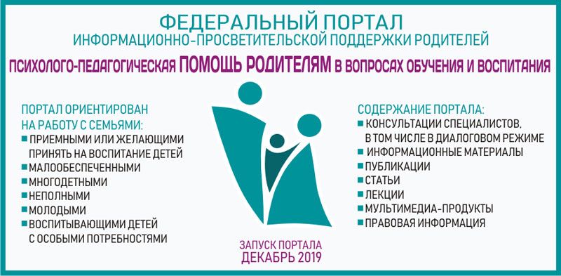 Федеральный портал нацелен на повышение грамотности родителей за счет оказания информационно-просветительской, методической и консультативной поддержки родителям детей, в том числе в возрасте до 3-х лет, по вопросам образования и воспитателя, а также смежным вопросам. Портал призван обеспечить взаимодействие родителей с образовательными организациями и способствовать формированию родительского сообщества.