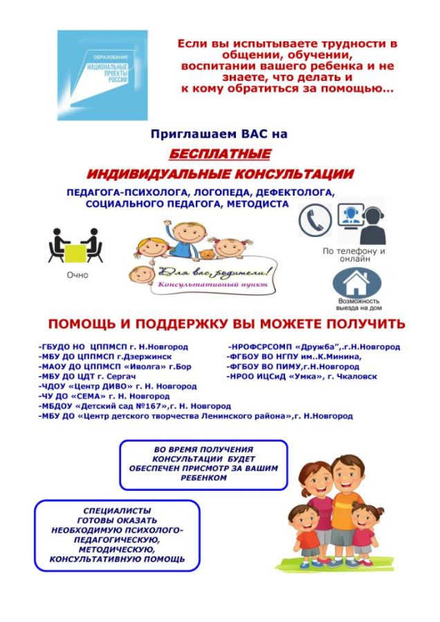 Уважаемые родители! Вы испытываете трудности в общении, обучении, воспитании вашего ребенка? Не знаете что делать и к кому обратиться за помощью? Приглашаем вас на БЕСПЛАТНЫЕ КОНСУЛЬТАЦИИ ДЛЯ РОДИТЕЛЕЙ